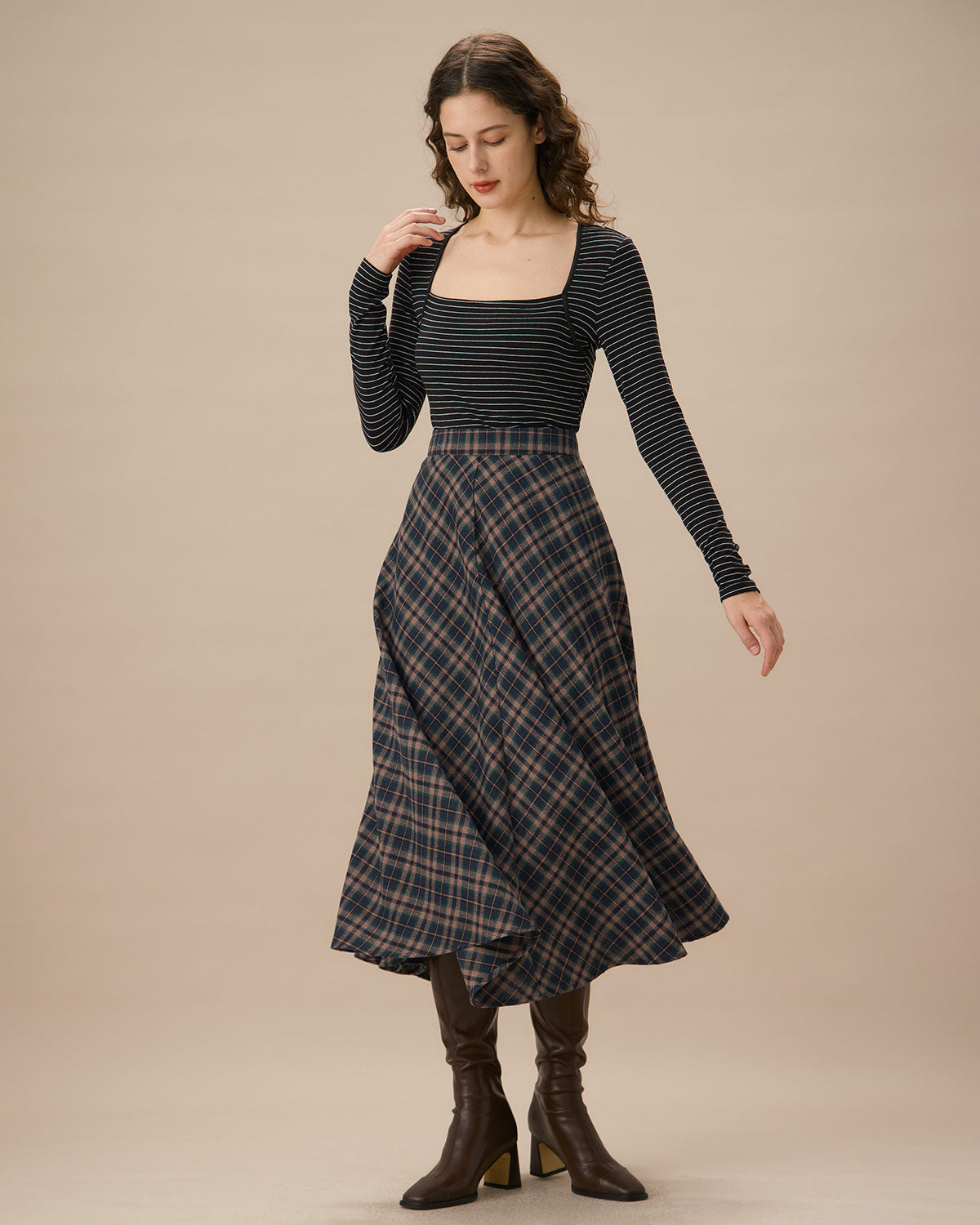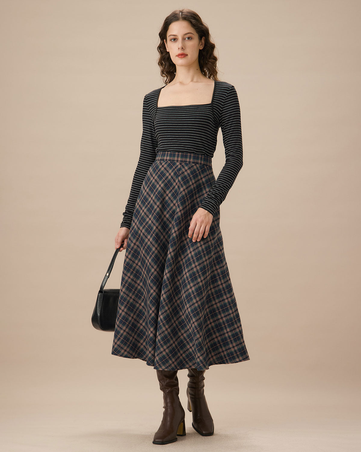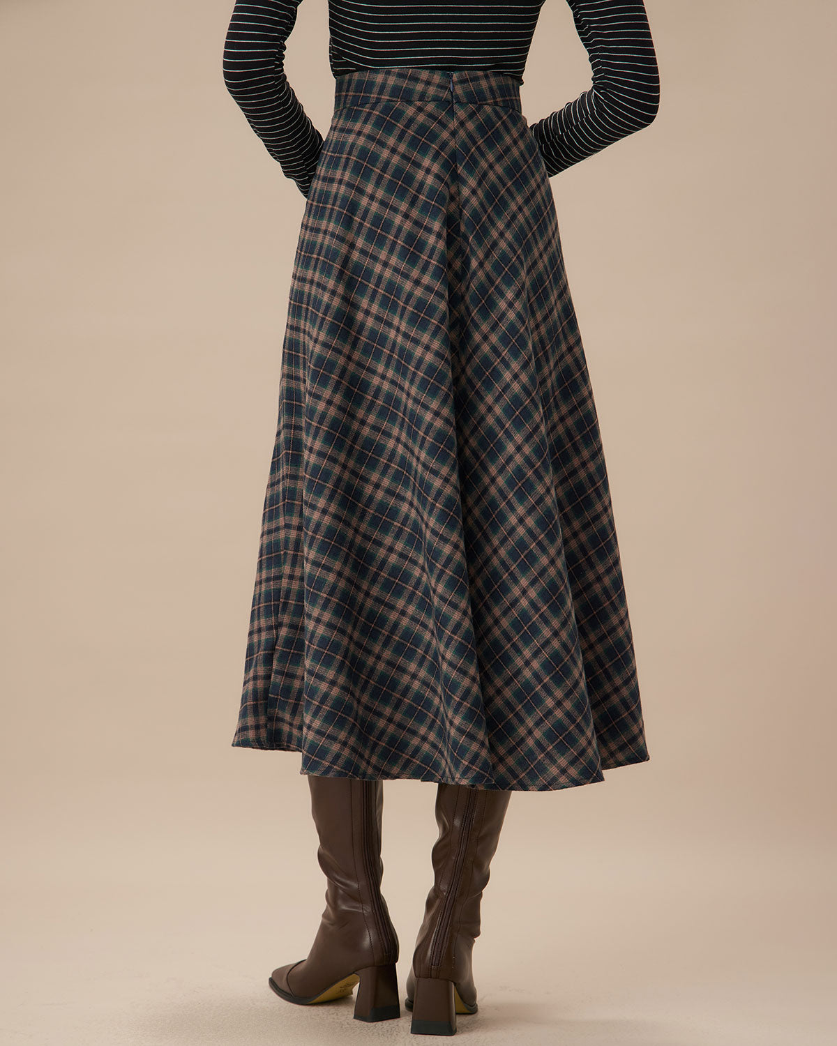 Navy Plaid Flared Midi Skirt